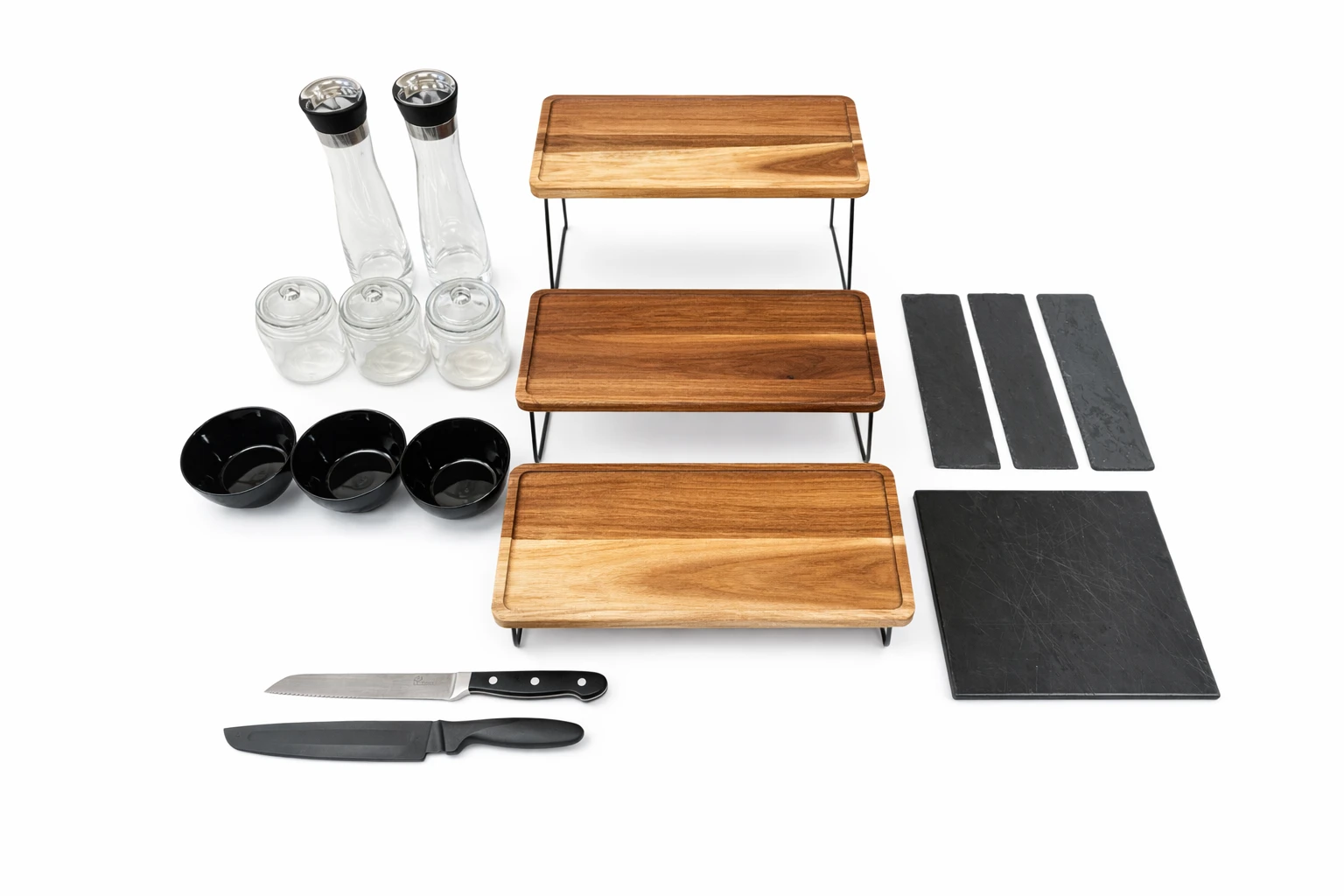 - Bocaux - Bols - Planches à découper - Planches en ardoise - 3 panières - 2 carafes - Couteaux